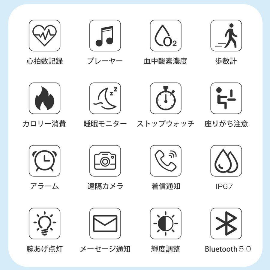 24時間血中酸素測定、心拍計、血圧測定、活動量計、歩数計、座りがちの自動注意、睡眠モニター、SMS通知、電話の着信通知、アラーム、データ同期、データ分析。時計機能はもちろん、