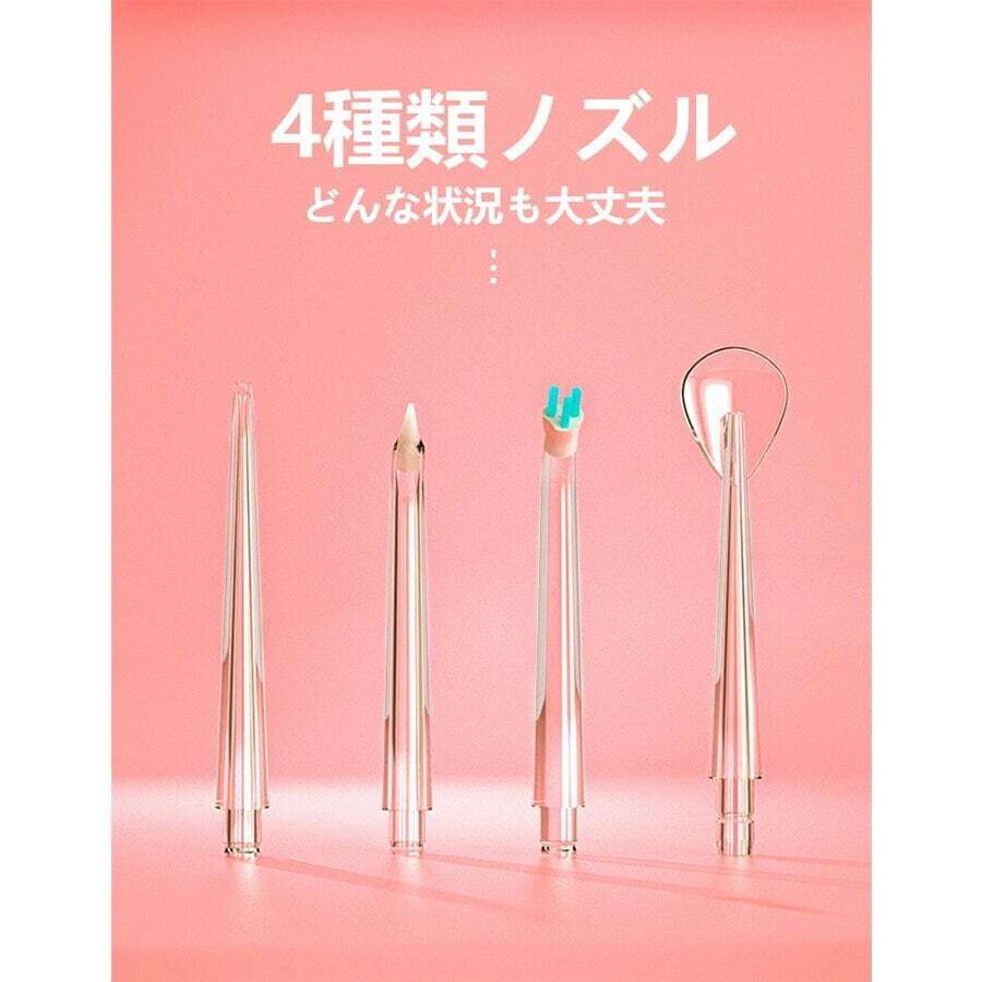 セットには標準ノズル、タングクリーナー、歯列矯正器用ノズル、歯周ポケット用ノズル、5本ノズルが付属されています。ジェット水流で日常の届きにくい歯周ポケット、歯並びの悪い所、矯正器具の周りなどの汚れをすっきり洗浄でき、虫歯、歯ぐき出血などを予防することもできます。