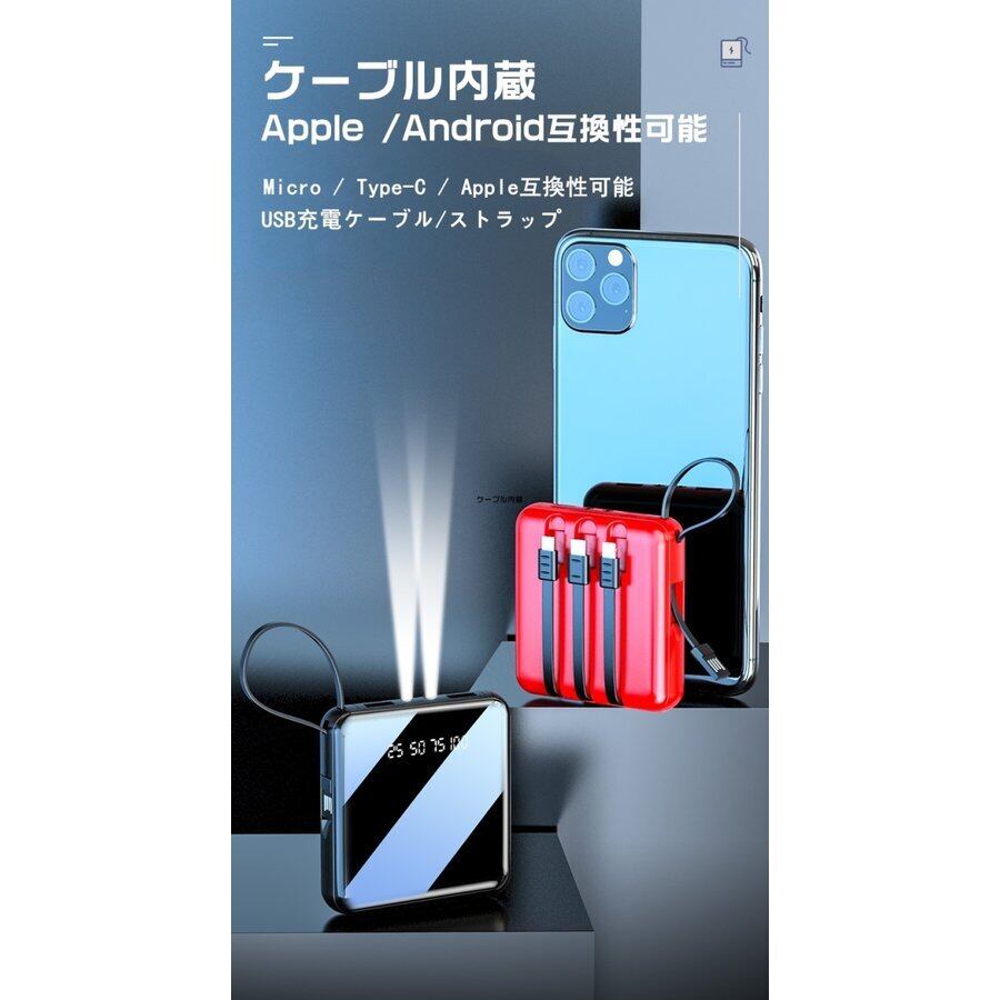 モバイルバッテリー 20000mAh 大容量 ミニ 超軽量5台同時に充電 4本ケーブル内蔵 バイルバッテリー 軽量 2.0A入力 スマホ充電器 懐中電灯 LCD残量表示