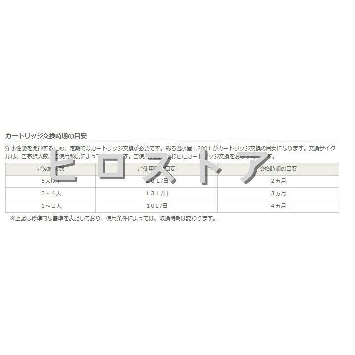 浄水カートリッジの交換時期目安:2ヵ月(20L/日使用の場合)、3ヵ月(13L/日使用の場合)、4ヵ月(10L/日使用の場合)